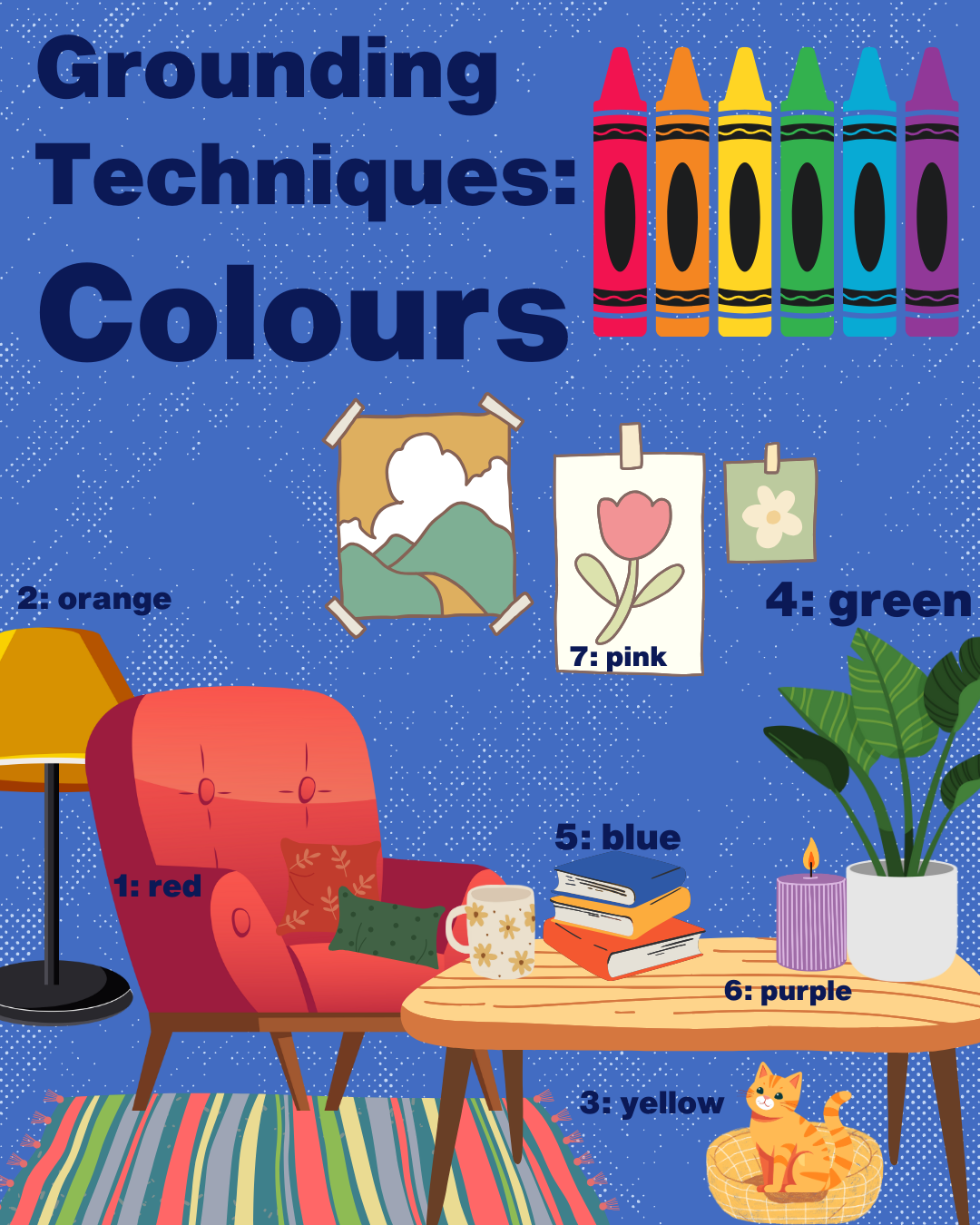 One grounding technique I learned from a client involves using colours to regain focus. When feeling overwhelmed, they would scan their surroundings and identify objects in the order of the rainbow: